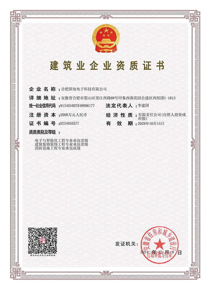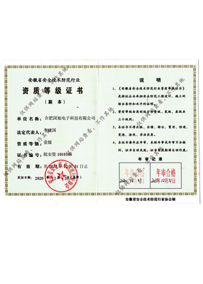 公司現(xiàn)已獲得承裝(修、試)電力設施許可證、電子與智能化工程專業(yè)承包壹級資質、建筑裝修裝飾工程專業(yè)承包壹級資質、消防設施工程專業(yè)承包貳級、安全技術防范行業(yè)壹級資質、雷電防護裝置檢測資質證乙級資質、安全生產許可證、通過ISO9001:2015質量管理體系認證、ISO14001:2015環(huán)境管理體系認證、OHSAS18001:2007職業(yè)健康安全管理體系認證等榮譽。我們還將進一步努力,爭取贏得更多的榮譽。