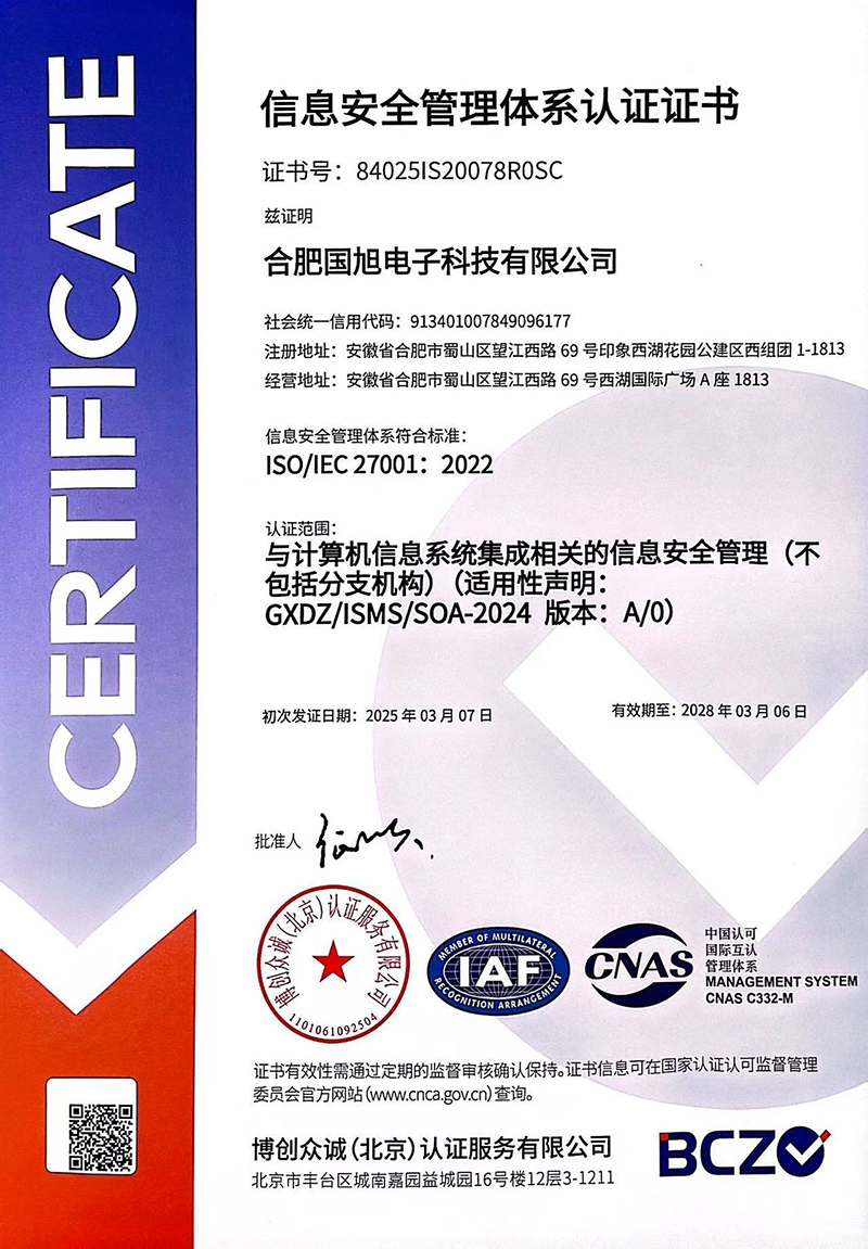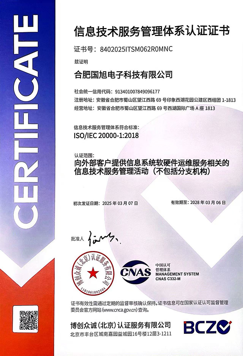 合肥國旭電子科技有限公司創(chuàng)立于2006年,總注冊資本2008萬。公司總部地址位于安徽IT主流商圈核心,合肥市蜀山區(qū)望江西路與肥西路交口西湖國際廣場。 公司是專業(yè)從事智能防雷檢測系統(tǒng)、智能化工程設計與施工工程、防雷設計施工工程、數(shù)據中心機房、消防工程、網絡監(jiān)控安全技術防范工程、及智能變電站安全預警系統(tǒng)。